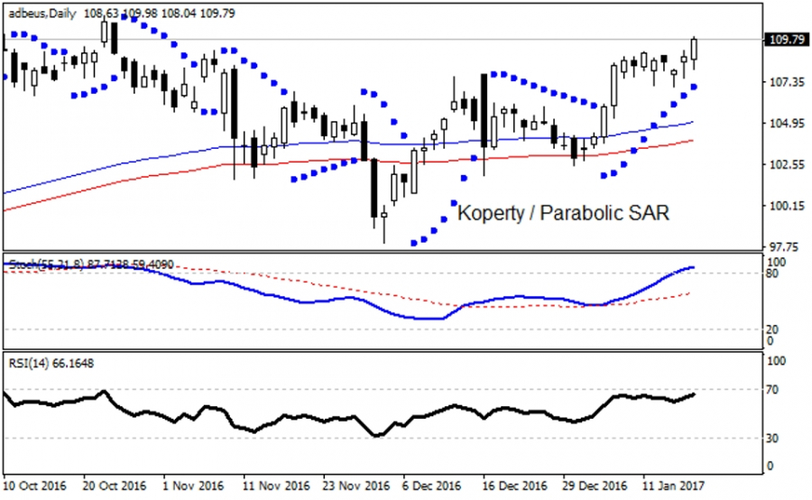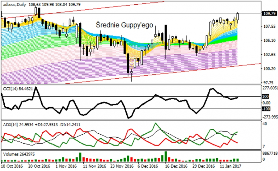 Kurs nowojorskiego akcjogramu (ADBE ) znajduje się w krótkoterminowej fali wzrostowej, oscylując w niej od 11 sesji według wskazań CCI, którego linia sygnalna dynamicznie zawróciła spod -100 punktów. Podtrzymanie zwyżkowej tendencji powinno być potwierdzone zachowaniem wsparcia 105,21 USD, a więc ewentualne zejście pod unoszące się, najszybsze żółte r-MMA może zmusić popyt do ważnej reakcji obronnej. Wówczas siła podaży powinna być uzależniona od statusu ww. wsparcia, ale także od zachowania lub połamania bariery 110,05 USD, gdzie obecnie mamy istotny opór. Roczny zakres wahań spółki to 71,27 - 111,09 USD, przy wskaźniku Beta na poziomie 1,05.