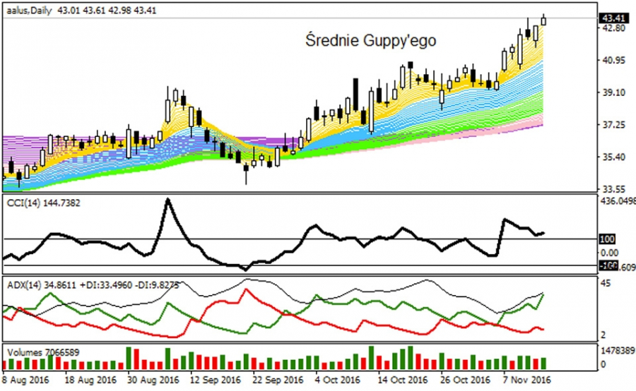 Na rynku AAL konkurują ze sobą dwa trendy, z których jeden będzie musiał ulec wyczerpaniu. Obecna korekta wzrostowa, redukująca długofalowy zakres spadków, liczy już blisko 100 sesji i przynosi akcjonariuszom ponad 70% wzrost notowań. W ich trakcie doszło do pozytywnego przekształcenia wśród średnich modelu Guppy'ego tak, że średnioterminowe r-MMA przekroczyły w górę MA-200 a kurs znajduje się po tym technicznym zabiegu nieco ponad 18% powyżej SMA z 200 sesji.