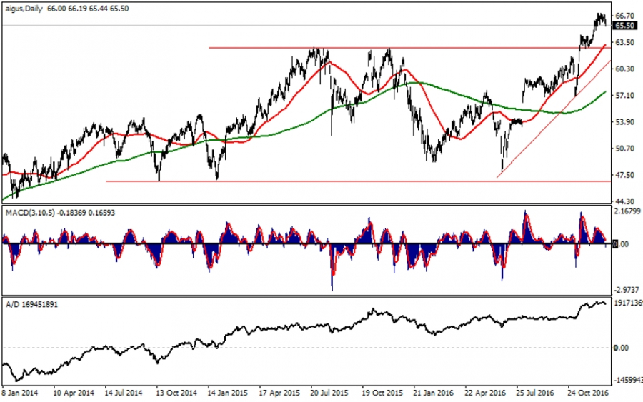 Wykres dzienny AIG pokazuje, iż przez przeszło dwa lata wahania ograniczał trend boczny, którego granice można wyznaczyć w rejonach 46 i 63 USD. W końcówce tego okresu kolejna obrona dolnego ograniczenia kanału bocznego zaowocowała lokalnym trendem wzrostowym, który okazał się bazą do wybicia i w ramach tego samego impulsu wykres dotarł w rejon 67 USD. Mierząc potencjał zwyżki szerokością kanału w zasięgu jest rejon 80 USD, więc każde cofnięcie może być traktowane w kategoriach korekty. W popytowym obozie grają prowzrostowe przecięcie średnich z 50 i 200 sesji, położenie wykresu nad każdą z tych średnich i wreszcie silne wsparcie tworzone przez spotkanie połamanego oporu na górnym progu kanału i linii lokalnego trendu wzrostowego. Korekcie sprzyjają sygnały sprzedaży na oscylatorach i korekcyjne ułożenie ADX/DI.