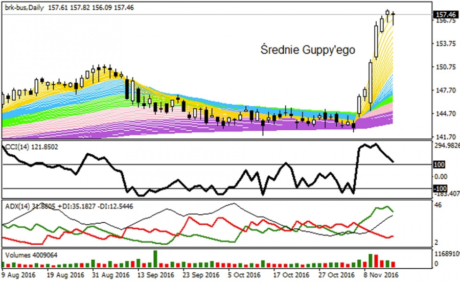 Za rozwinięciem fazy wzrostowej opowiada się silne wskazanie na DMI, przy unoszących się w górę dynamicznych średnich wg Guppy'ego. Także najwolniejsze r-MMA zainicjowały prawdopodobnie nową fazę przesilenia na analizowanym rynku, gdyż wyjście kursu górą ze wspomnianej wcześniej konsolidacji podkreśliło przewagę popytu w średnim horyzoncie czasowym. Aktualnie RSI, będący powyżej 70 punktów, pokazuje, że walor BRK.B jest w przesilonym lokalnie układzie z oznakami wykupienia, ale jednocześnie z wykreowanym potencjałem na dalsze podbicia. Pamiętajmy jednak, że pro-wzrostowy układ sił na BRK.B będzie tylko wtedy aktualny, gdy zostaną zachowane wsparcia 145,06 - 137,15 USD.