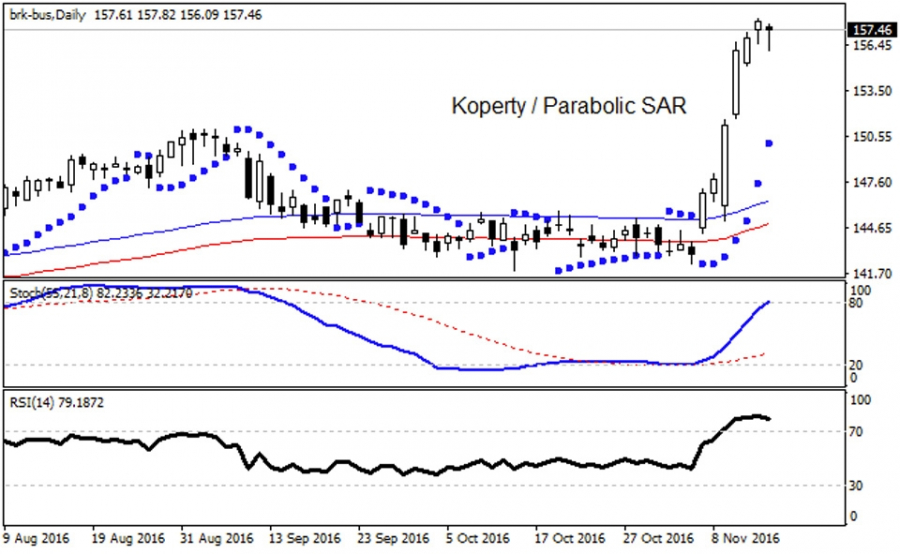 Walor (BRK.B ) znajduje się w pozytywnych oscylacjach hossy, zyskując 27,45% względem rocznych minimów. Ostatnie listopadowe sesje doprowadziły do bardzo ważnego technicznie wybicia kursu z zakresu szerokiej konsolidacji 153 - 136 USD. Narastająca, miesięczna zmienność niniejszych akcji sięga obecnie 2,27%, przy ATR wynoszącym 2,15 wobec aktualnej, rynkowej wyceny 157,46 USD za jedną akcję BRK.B.