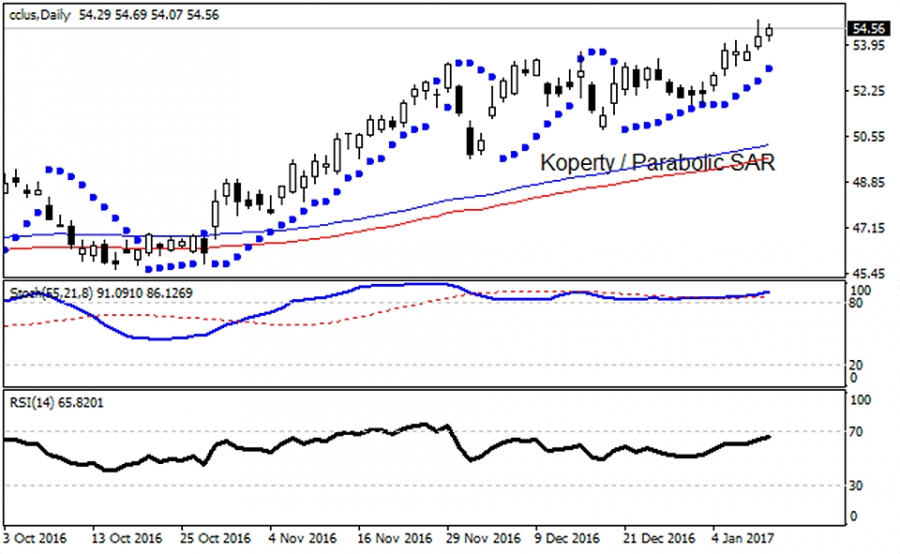 Akcjogram (CCL ) dynamicznie wybił się w ostatnich dniach powyżej górnego ograniczenia konsolidacji 53,37 - 49,74 USD. Walor ten ma za sobą blisko 38 procentową zwyżkę względem 52 tygodniowych minimów a do tego znajduje się prawie 0,6% poniżej maksimów wszechczasów. Warto także przypomnieć, że wykres CCL konsolidował się w długofalowym spojrzeniu niespełna 12 miesięcy w ramach szerokiego kanału - przystanku w hossie 39,40 - 53,37 USD. Mamy zatem ciekawą próbę przetestowania wiarygodności wspomnianego wybicia w stronę 55 - 60 USD.