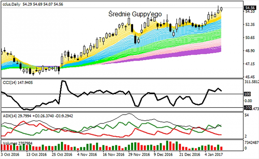 Ponadto lokalny przedział 54,77 - 49,74 USD może zostać rozszerzony, jeśli DMI / ADX nabierze większego impetu i zgodności z krótkoterminowym ruchem. Wznoszące się, średnioterminowe i najwolniejsze średnie z modelu Guppy'ego kroczą istotnie na północ natomiast bieżąca faza zwyżkowa wg kupna na CCI / STS w pewnym momencie uzyska stan przesilenia, aby powiedzieć "sprawdzam" ważnej barierze zwrotnej tj. pro-podażowemu TL 55,76 - 57,85 USD. Taki test mógłby wypaść pozytywnie, zbieżnie do ww. sygnałów kupna a wówczas dostaniemy odpowiedź, że prawie roczne, horyzontalne położenie CCL było tylko przystawką w długoterminowej fazie umacniania.