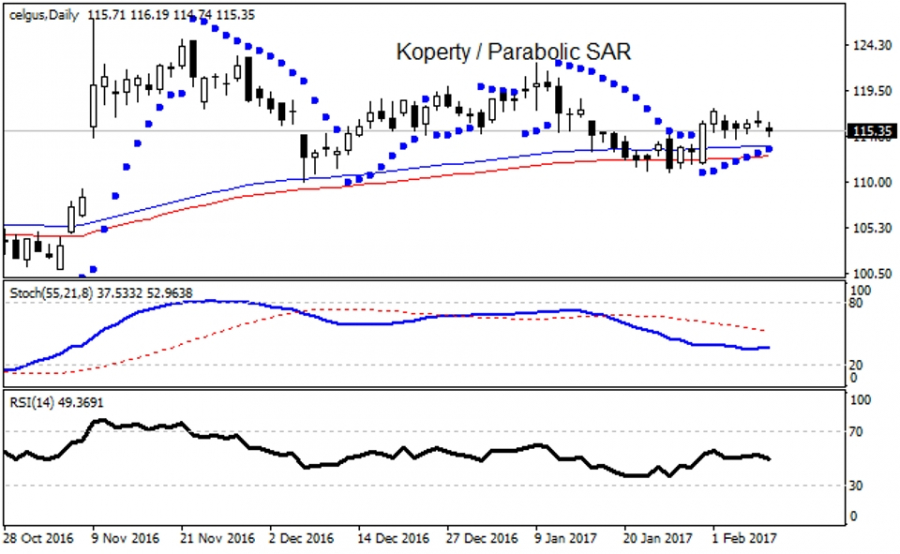 Kurs nowojorskiego akcjogramu (CELG ) znajduje się w krótkoterminowej konsolidacji, oscylując w niej od 5 sesji według wskazań CCI, którego linia sygnalna dwukrotnie, dynamicznie zawróciła znad +100 punktów. Podtrzymanie horyzontalnej tendencji powinno być potwierdzone zachowaniem wsparcia 110,87 USD oraz oporu 117,45 USD. Ewentualne zejście pod unoszące się, najszybsze różowe r-MMA może zmusić popyt do ważnej reakcji obronnej. Wówczas siła podaży powinna być uzależniona od statusu ww. wsparcia. Roczny zakres wahań spółki to 94,39 - 127,00 USD, przy wskaźniku Beta na poziomie 1,79.