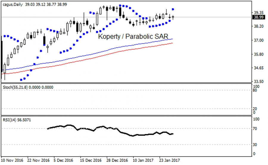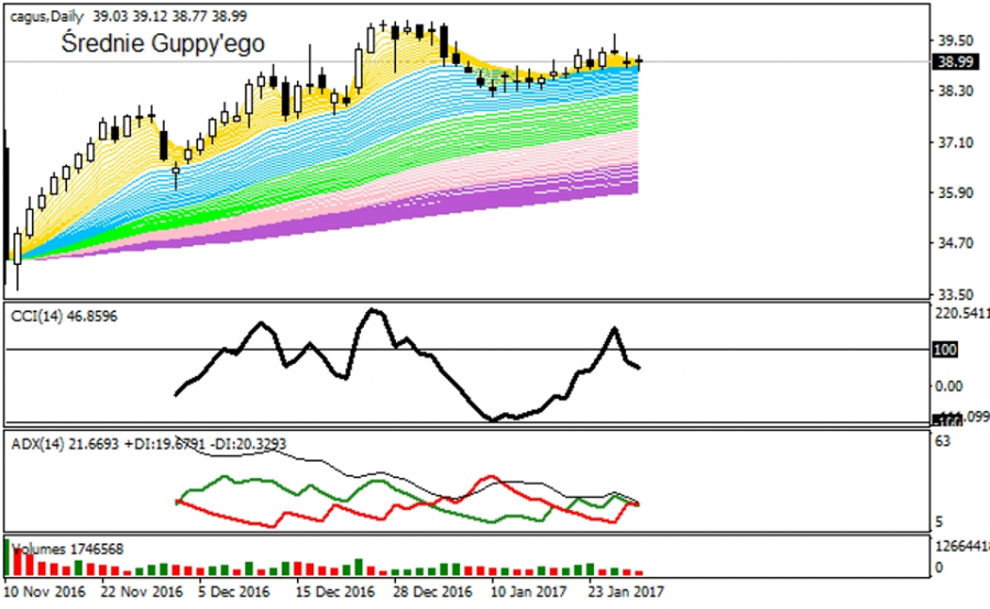 Silne umocnienie względem wskazanych, listopadowych minimów z 2016 roku pozwoliło na wznowienie hossy na CAG, wygenerowało sygnały fali wzrostowej w układzie dziennym na modelu Guppy'ego wg najszybszych r-MMA, ale co ciekawe nie doprowadziło do trwałego, przesilonego wykupienia kursu wg RSI, więc prawie trzymiesięczny dryf walorów CAG na północ nie musi zostać zakończony. Wskaźnik DMI / ADX sygnalizuje tendencję boczną, więc można w związku z tym uznać, że kurs wyczekuje na kolejny impuls do silnej fali cenowej. Wyjście z zakresu 40 - 38 USD powinno stanowić tylko przedsionek do dalszych zmagań, co powinno współgrać z kierunkiem na MA-200 i co zaważy na nastawieniu wobec dołka cenowego 33,61 USD.