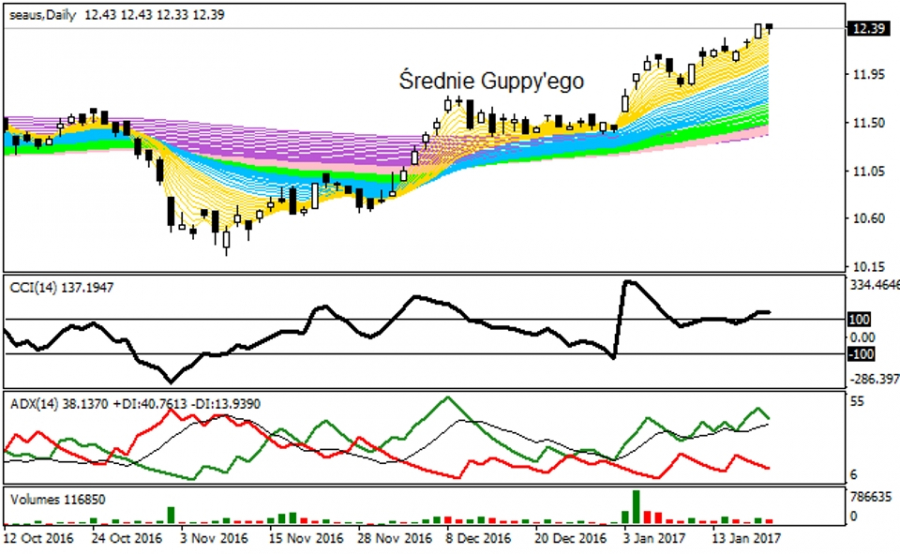 Analizowany ETF SEA podlega wskazaniu kupna na DMI w układzie dziennym, również wg STS w ujęciu tygodniowym, który nadal stawia w wyższych interwałach na kreowanie fali odreagowania. Z kolei wskaźnik RSI notuje wysokie 71 punktów, ale zejście jego linii pod 30 punktów wprowadzi stan ostrzegawczy przed zwiększonym ryzykiem wkroczenia tendencji spadkowej. Co ciekawe średnie r-MMA podtrzymują świeży statystycznie układ hossy i dopiero przebicie się kursu przez popytową strefę 11,40 - 10,31 USD zmieni globalne nastawienie uczestników tego rynku co do bieżącego trendu.