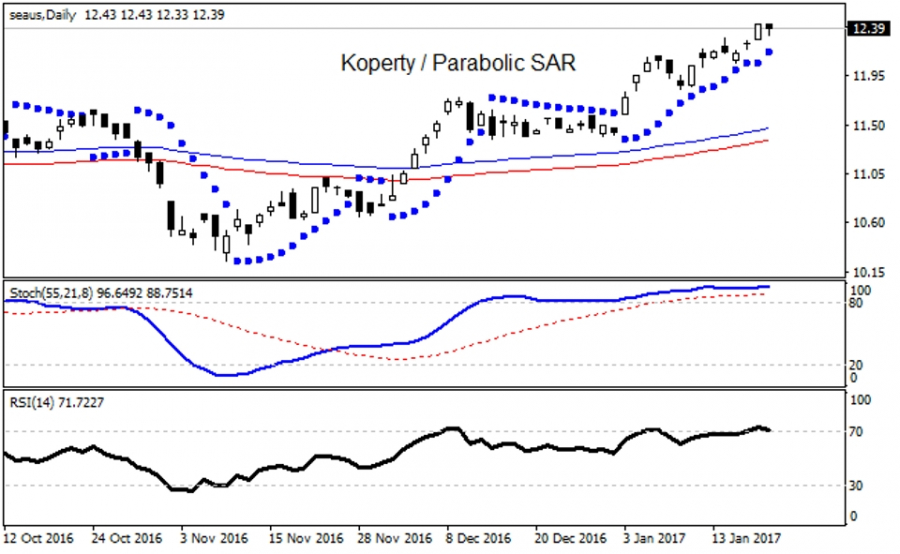Kurs (SEA ) zawahał się podczas ostatnich trzech sesji w zakresie 12,43 - 12,20 USD, łamiąc okoliczny opór 12,25 USD, tuż poniżej którego cały czas są aktywne pro-popytowo ważne punkty spustowe tj. tygodniowy S1 12,19 USD a także wg ujęcia miesięcznego PP 11,40 USD. Wskazany ETF jest jednocześnie w cennej strukturze zwyżkowej od przeszło 230 sesji, w której zanotowano wzrost kursu o blisko 36%.