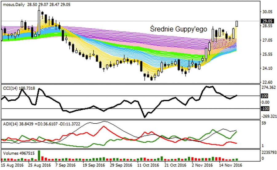 Od początku 2016 roku akcje spółki Mosaic (MOS ) traciły przejściowo nieco ponad 19 procent, natomiast obecnie są na blisko 9 procentowym plusie. W istocie tegoroczny spadek przedłużył kilkuletnią falę wyprzedaży, która odpowiada za przecenę akcji o niespełna 80 procent. Warto przy tym zauważyć, że notowania MOS dopiero co dynamicznie potwierdziły długofalowe wsparcie 23,37 USD, które także działało pod koniec 2008 roku, jak i również w styczniu i październiku 2016 r. Po stronie popytu stoją ważne oscylatory, jak np. RSI oraz STS. Ponadto model średnich Guppy'ego sygnalizuje prawdopodobnie zmianę trendu, gdyż najszybsza, żółta wstęga przekracza właśnie r-MMA z 200 sesji. Jeśli zatem kurs nie przebije w najbliższych tygodniach wsparcia 23,37 USD a ww. przecięcie średnich się utrzyma to wówczas kurs uzyska techniczny impet do oscylowania na północ w stronę ważnych, twardych oporów. Ponadto warto wiedzieć, że Beta niniejszych akcji sięga 1,3 a narastająca, miesięczna zmienność wynosi ok. 3%. Roczny kanał wahań to 21,36 - 31,68 USD.