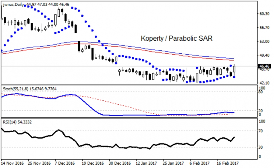 Wskaźniki koperta cenowa, wolny STS, SAR / DMI / ADX podtrzymują rozbieżne wskazania- typowe dla stanów wychodzenia z konsolidacji, a kurs JWN właśnie testuje górne ograniczenie horyzontalnej formacji, ograniczonej 47 - 42 USD. Dopiero przebicie się przez wskazane, pobliskie opory i wysłanie transparentnego, wypadkowego kupna na wymienionych wskaźnikach zaneguje opcję słabości, jaką podtrzymują długofalowe średniej r-MMA.