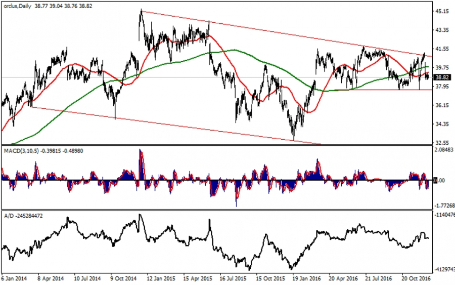 Technicznie patrząc od kilkunastu miesięcy wykres Oracle porusza się w kanale spadkowym. W ostatnim czasie cena zbliżyła się do górnego ograniczenia kanału i skonsolidowała na półce pomiędzy linią trendu spadkowego o wsparciem w okolicach 37,60 USD. Zamknięcie pomiędzy dwoma tendencjami jest czytelne i pozwala oczekiwać na przesilenie. Cofnięcie w rejon 37,60 USD nie będzie groźne - ledwie podtrzyma konsolidacyjny układ z ostatnich miesięcy - ale wybicie górą z kanału zmieni układ sił na wzrostowy. Spojrzenie na wykres w perspektywie 10-letniej ujawnia, iż to, co jest kanałem spadkowym może być również dużą formacją kontynuacji wcześniejszego trendu wzrostowego. W efekcie potencjał zwyżki po wybiciu z kanału byłby znacznie większy niż szerokość kanału. Z punktu widzenia oscylatorów wykres prezentuje się poprawnie dla strony popytowej. Niskie położenia RSI czy oscylatorów stochastycznych sygnalizują, iż w ramach trendu ocznego podaż traci siły i możliwe jest kolejne podejście w rejon 41,14-40,74 USD.