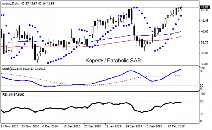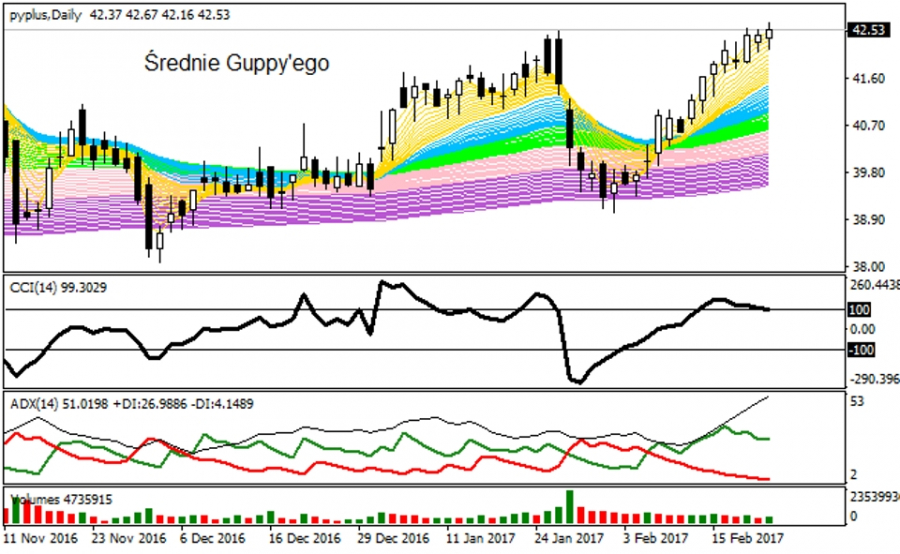 Notowania PYPL znajdują się w krótkoterminowej fazie wzrostowej, oscylując od 10 sesji w zakresie żółtej - niebieskiej wstęgi modelu Guppy'ego, która wypadkowo się unosi. Podtrzymanie zwyżkowej tendencji powinno być potwierdzone zachowaniem wsparcia 40,62 USD lub skutecznym wyjściem powyżej maksimum 44,52 USD, które akcjogram wybił 24 października 2016 roku. Szybkie oscylatory techniczne wskazują stan braku argumentów wśród grona podażowego i ten stan nie jest na ten moment równoznaczny z wykupieniem.