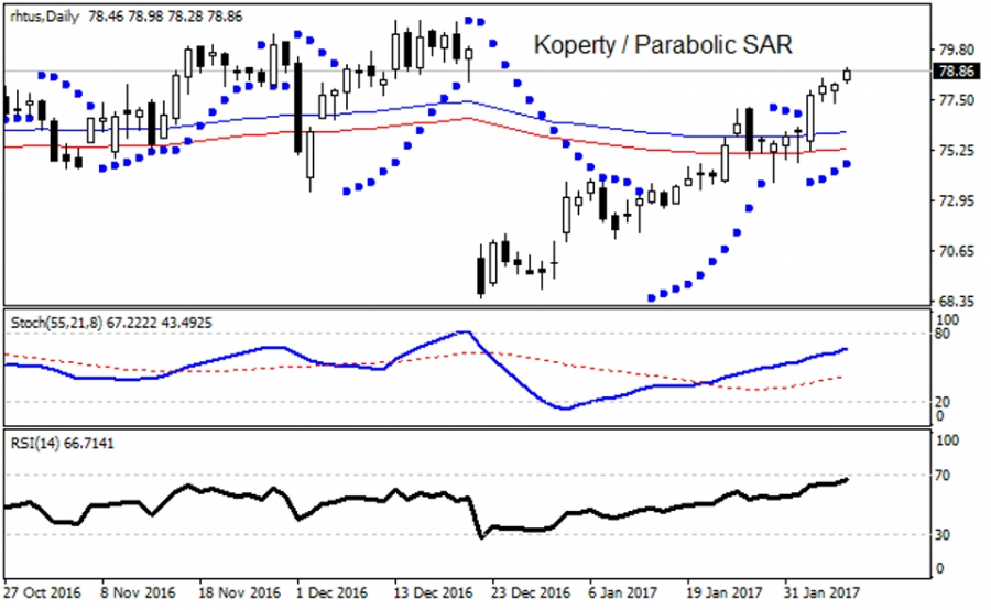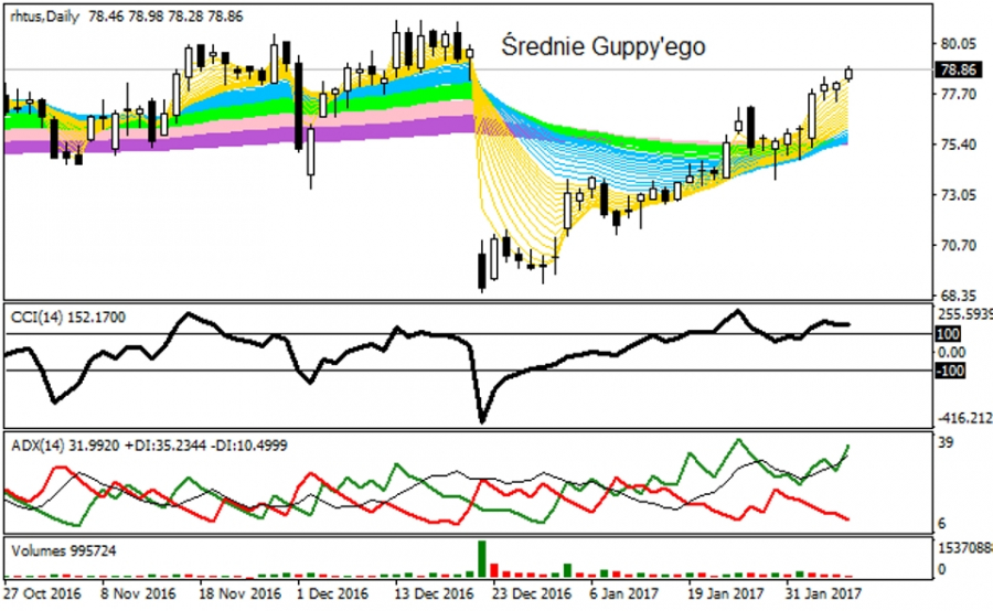 Nie wolno jednak zapominać, że także na rynku RHT występują korekty spadkowe w hossie, które często znoszą kurs w dół spod ekstremalnych poziomów o ok. 15 - 20 procent a miejscami zniżki sięgają nawet 30 - 35 procent. Z punktu widzenia techniki w układzie D1 mamy obecnie prowadzenie nowej fali trendu wzrostowego, który dopingowany jest przez silne kupno na DMI / ADX. Jeśli walor utrzyma się ponad TL 73,81 USD to zwyżka będzie mogła postępować w kierunku oporów 80,44 - 84,90 - 85,90 USD, natomiast przebicie wskazanego TL powinno wg zasad Price Action kierować walory do mocnej strefy popytowej 71,81 - 65,80 USD. Aktualnie większość wskaźników AT nastawiona jest na wzrosty, ale pamiętajmy, że walor zyskał już blisko 30% r/r, co doprowadziło wskaźnik RSI pod wygórowany poziom 66 punktów.
