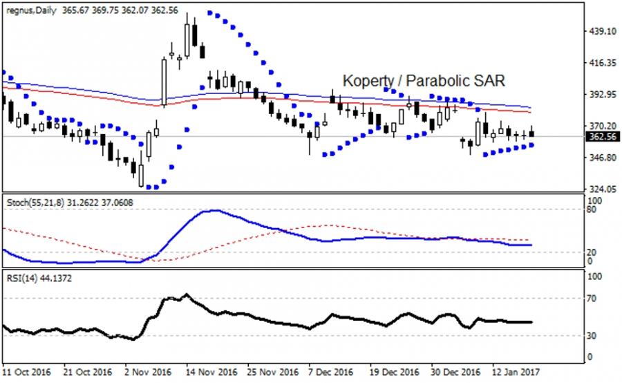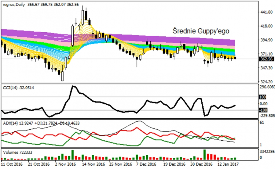 W 2016 roku wykres spółki wyczerpał fazę trendu spadkowego klasyczną formacją podwójnego dna w okolicy 329 - 325 USD. Walor (REGN ) zainicjował ze wskazanej strefy wsparcia ruch wzrostowy, który odbył się w ramach wyższej czasowo korekty typu a-b-c. Doprowadziła ona analizowane akcje do oporu 445 - 449 USD, skąd nastąpiło dynamiczne cofnięcie się kursu w obszar ważnego wsparcia 349 USD. Jego zachowanie wraz z połamaniem ww. oporów dałoby cenny impuls BIAS do hossy, ale z drugiej strony złamanie powyższych barier wsparcia nakaże wyliczać zasięgi ryzykownej fali spadkowej jako przedłużenie przecen z 2016 roku.