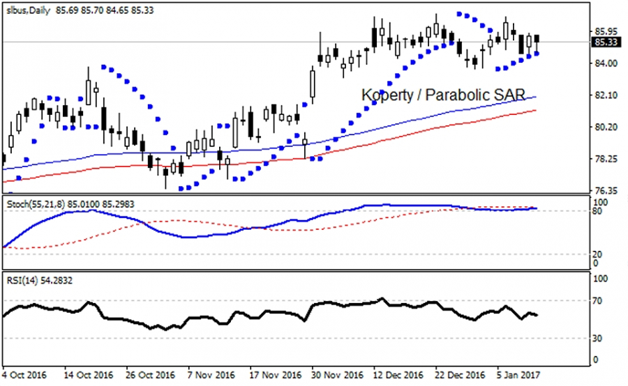 Ostatnie pięć miesięcy handlu przyniosło słabą zwyżkę akcjogramu (SLB ) o blisko 6,5%. Kurs umacniał się w drugim półroczu 2016 roku z rejonu 74 USD do wartości 87 USD, co wykształciło 16% zakres zmiany. Wybicie górą ponad 87 USD powinno zostać uznane przez rynek za próbę wznowienia dłuższej czasowo fali wzrostowej. Aktualnie popyt może napotkać przy ww. barierze aktywizację ze strony sprzedających, ale warto pamiętać o czynnej luce spadkowej z 19 czerwca 2015 roku (zakres 88,63 - 87,57 USD), która istotnie przyciąga kurs. Okoliczne wsparcia pozwalają na reaktywację popytu, jeśli cenowo uda się wyprowadzić kontrę z obszaru 84,05 - 83,23 USD lub jeśli w dalszych tygodniach kurs nie przebije utworzonego dołka 83,95 USD wg CCI dn. 30 grudnia 2016 r. W przeciwnym razie kurs będzie zniżkował do strefy 82,72 - 78,46 USD.