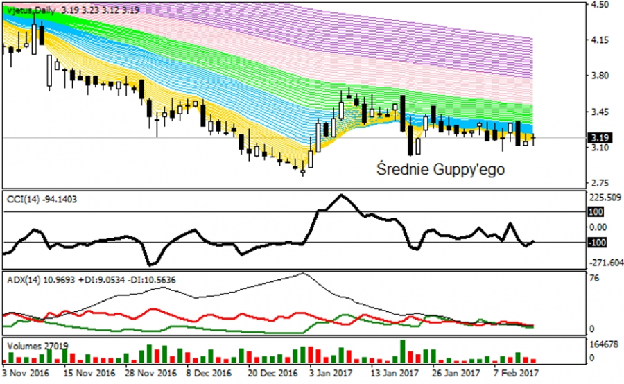 W ostatnich trzech tygodniach wystąpił układ korekcyjny, wzrostowy wg Price Action, który na podstawie odczytów z DMI / ADX stanowi jednak tendencję horyzontalną. Warto zauważyć, że linia CCI w ostatnich 50 sesjach kreśliła coraz to wyższe minima, oczywiście w oscylacyjnym ruchu. Co pewien odstęp czasu linia ta wykraczała powyżej -100 punktów a później opadała pod tą barierę, nie przebijając wcześniejszych minimów linii CCI z poprzednich 30 sesji. Równolegle do takiego zachowania kurs notował najpierw coraz to niższe poziomy, ale od początku 2017 roku omawiane oscylacje zaczęły współgrać z zachowaniem się wskaźnika CCI. To oznacza, że kurs VJET jest na torze korekty wzrostowej, ale na ten moment wg DMI / ADX jest ona prawie niezauważalna. Przełamanie wsparcia 3,02 USD zaneguje wg Price Action opcję odreagowania na analizowanym rynku.