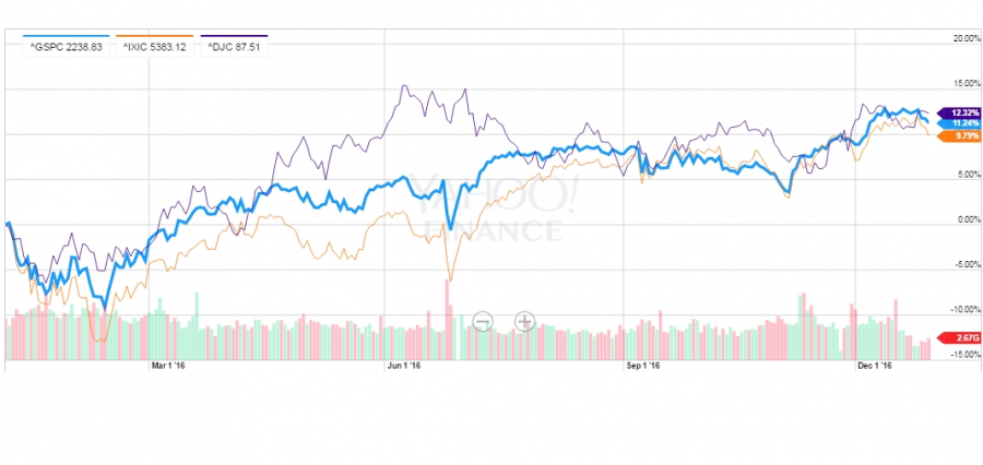 Giełdy w Stanach Zjednoczonych są obecnie na maksimach i ciężko powiedzieć jak długo to jeszcze potrwa. Powszechna jest opinia, że dopóki trwa dodruk pieniądza, dopóty będziemy mieli wzrosty. S&P 500 wzrósł o 11% w 2016, a już mówiło się o krachu od 2015 roku. Ceny akcji w Stanach Zjednoczonych są dość drogie, ale wciąż nie jest aż tak drogo jak w 2008 roku. Warto zauważyć, że następują pewne zmiany w strukturze wzrostów na S&P 500. Sektor technologiczny bijący rok w rok S&P 500, złapał zadyszkę w ostatnim roku. Z pewnością silny dolar wpływa negatywnie na eksporterów z sektora technologicznego. Nie ulega wątpliwości, że zwycięzcą minionego roku w Stanach Zjednoczonych był DJC, czyli index czołowych spółek w USA. DJC wzrósł ponad 12%. To jest najlepszy dowód na to, że coś się zmienia w amerykańskiej gospodarce.