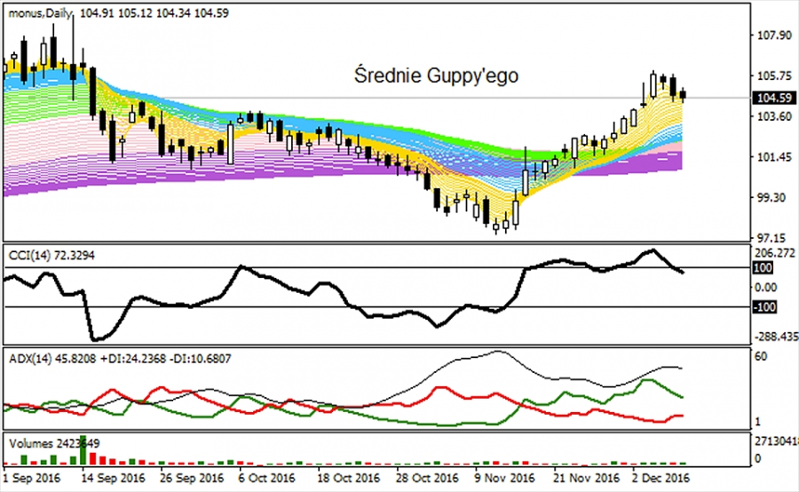 Ostatnie pięć miesięcy przyniosło najpierw silny spadek notowań (MON ) z rejonu 108,90 USD do minimów 97,35 USD a następnie wykreowanie ruchu wstępującego do hossy na wskazanych walorach Monsanto. Dzięki listopadowo - grudniowym zwyżkom notowania MON są prawie 8% wyżej od ww. poziomów minimalnych. Ponadto kurs posiada wg średnich Guppy'ego impuls BIAS do dłuższej fali wzrostowej, gdyż żółte i niebieskie wstęgi wymaszerowały ostatnio powyżej r-MMA 200, co jest odczytywane przez inwestorów za dominowanie strony zakupowej i wstęp do trendu umacniania kursu, jeśli oczywiście notowania nie zejdą ponownie poniżej ważnego pivotu 101,09 USD.
