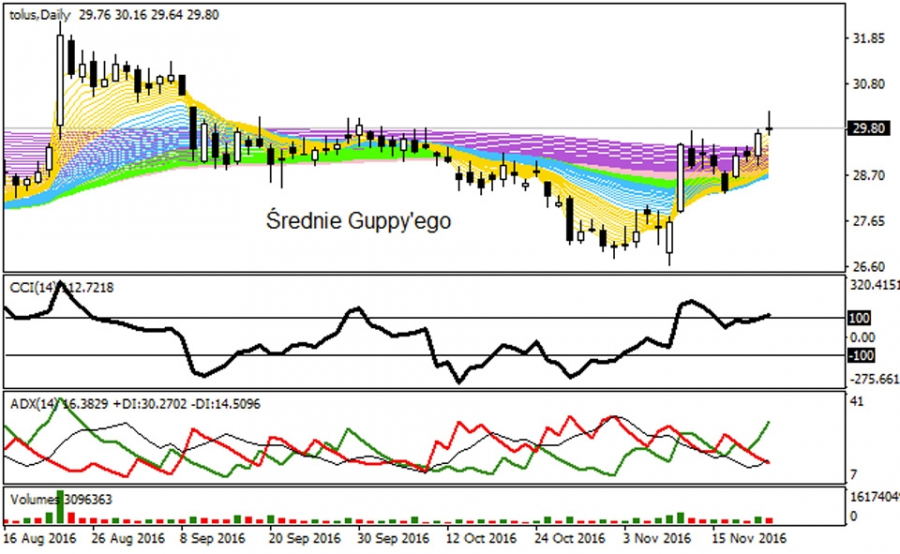 Umiarkowanie podwyższone poziomy RSI świadczą z kolei o umacnianiu ww. walorów a więc walka tuż ponad najwolniejszą, fioletową średnią r-MMA może przynieść sporo argumentów, rozstrzygających układ sił w konsolidacji 32 - 26 USD, w jakiej od blisko 70 sesji znajduje się TOL. Po wyjściu górą ze wspomnianej konsoli kurs będzie mógł jak najbardziej przejść do dalszej ekspansji zwyżkowej w stronę oporu 35,44 USD, do czego nakłania lokalne kupno wg DMI.
