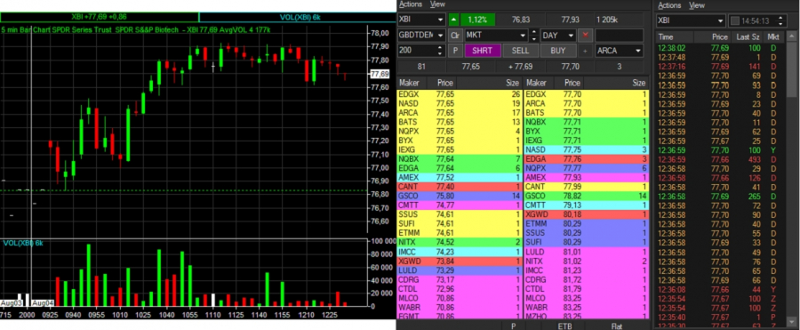 Tak jak nie gra się raczej na dużych medialnych spółkach, o czym pisałem niedawno, tak samo traderzy indywidualni raczej omijają granie na topowych ETFach. Chętniej zawierają transakcje na nieco wolniejszych instrumentach. Przykładem może być tutaj piątkowy (4 sierpnia 2017 r.) wykres funduszu SPDR Series Trust SPDR S&P Biotech ETF (AMEX: XBI) - wahania ceny w przedziale $2, rozsądny spread, względnie czytelna drabina zleceń.