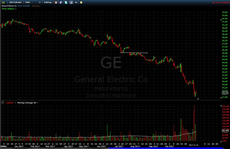 Serial kłopotów GE trwa już od miesięcy. Podczas lipcowego odczytu słabych wyników, inwestorzy również zareagowali dość nerwowo (na wykresie widać lukę). W firmie uruchomiono proces restrukturyzacji i zmiany w zarządzie. Działającego z rozmachem (w sensie "na bogato" - choćby historie z dwoma samolotami) Jeffa Immelt'a, który pełnił funkcję CEO GE od 2001 roku i przeprowadził firmę przez globalny kryzys, 1 sierpnia zastąpił John Flannery, wcześniej CEO GE Healthcare. Kiepskie perspektywy przedsiębiorstwa nie spodobały się także Warren'owi Buffett'owi, którego fundusz Berkshire Hathaway sprzedał niedługo później, warte ponad 300 mln $ posiadane akcje General Electric. To również symbol końca pewnej epoki. Nowy prezes zdecydowanie zaznacza, że nastąpi ograniczenie działalności, co w praktyce oznacza "ewakuację" firmy z nierentownych branż takich jak surowce, przemysł kosmiczny, koleje czy bankowość, które są kulą u nogi, bo generują duże koszty. W praktyce oznacza to kilkuletni proces reform, a i tak trudno przewidzieć ich skuteczność.
