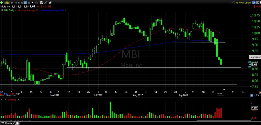 Spółka MBIA (MBI ), która świadczy usługi w dziedzinie gwarancji finansowych, to dobre rozwiązanie dla średnioterminowych inwestorów - spółka jest dosyć 'wolna', na wykresie nie widać 'niespodzianek'. W ostatnich dniach doszło do ważnego wyłamania wsparcia 9,65 $, wybronionego zaledwie kilka dni wcześniej. Spadek jest wiarygodny, bo podparty obrotem. Jest bardzo prawdopodobne, że po tak dużej przecenie pojawią się kupujący i cena zatrzyma się w okolicach poziomu 8,50 $, czyli pułap z czerwca tego roku lub odreaguje. To powinien być dobry moment na wejście w spółkę, po obrotach można odczytać, że byli chętni na akcje za 8,40-8,50 $. Zdecydowanie pomyślałbym o długiej pozycji, choćby na częściowe odreagowanie ponad 10% spadku.