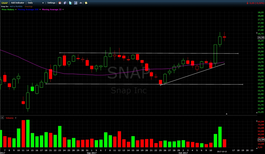 Po niemal trzech miesiącach konsolidacji w końcu coś drgnęło na akcjach Snap Inc (SNAP ). W środę, po opublikowaniu pozytywnej rekomendacji dla spółki dot. spodziewanego wyniku kwartalnego, doszło do silnego wybicia z trendu bocznego. Co ważne wybicie jest podparte ponad sześćdziesięciomilionowym wolumenem. Autor rekomendacji ustalił cenę docelową na 20 $, istnieje więc szansa na kontynuowanie wzrostu, choć zapewne w pierwszej kolejności uderzy podaż. Na dalszy przebieg ceny będą miały wpływ opublikowane wyniki.