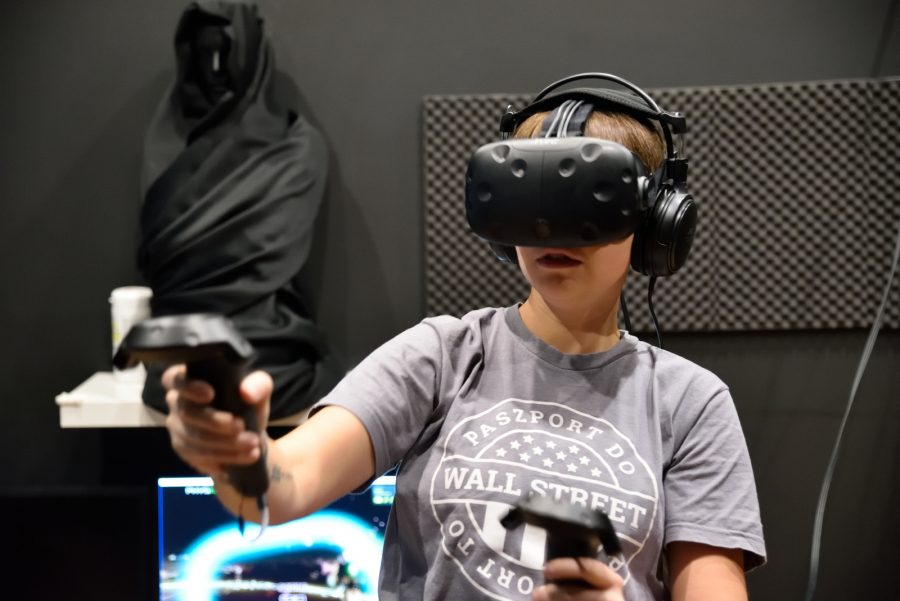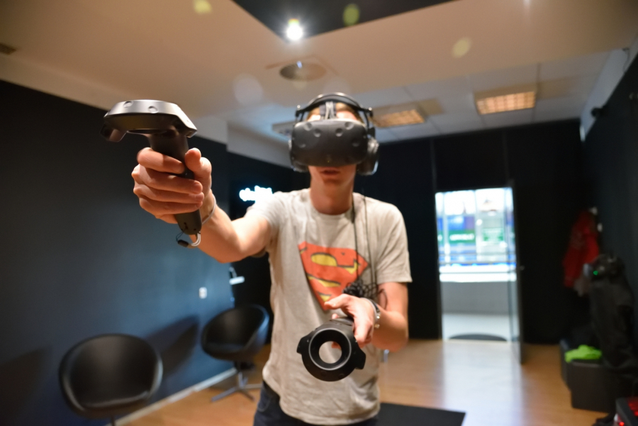 Następnym testowanym przez nas urządzeniem był zestaw HTC Vive podłączony do bardzo wydajnego komputera, który sprawdzaliśmy grając w gry VR. W skład zestawu oprócz gogli i słuchawek wchodzą także dwa kontrolery umożliwiające precyzyjne sterowanie. Jest ono możliwe dzięki laserowym czujnikom zamontowanym w kątach pomieszczenia, które dokładnie mierzą położenie kontrolerów. Sprzęt tajwańskiego producenta cechuje się znacznie lepszą jakością obrazu. Najwięcej czasu poświęciliśmy na grę The Brookhaven Experiment, która polega na odpieraniu ataków zombie. Bardzo realistyczna grafika oraz pełne spektrum obrazu sprawiają, że można się zapomnieć. Kontrolery w tej grze służą za broń palną oraz maczetę lub latarkę. Dzięki temu gracz wykonuje sporo ruchów rękoma, nieraz bardzo gwałtownych, kiedy z zaskoczenia od tyłu zachodzą go umarlaki. W trosce o zdrowie użytkowników i sprzęt, ściany w Cybersowie zostały ostatnio wyłożone gąbkami.