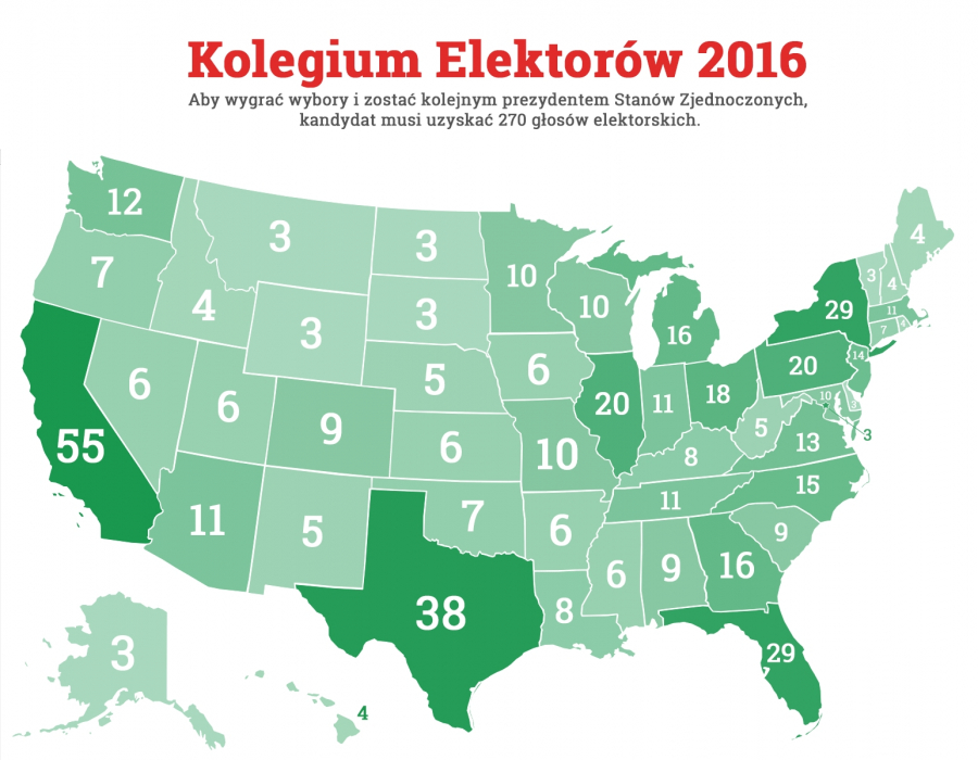Kolegium Elektorów to grupa 538 elektorów, którzy reprezentują poszczególne dystrykty w USA. Kolegium tworzy 435 reprezentantów stanów, 100 senatorów oraz 3 elektorów z miasta Waszyngton, ponieważ nie jest ono stanem. Każdy stan posiada na wstępie trzech elektorów, natomiast reszta przyznawana im jest na podstawie ich populacji. Bardziej zaludnione stany posiadają zatem więcej elektorów i tak na przykład Kalifornia, którą zamieszkuje prawie 40 milionów osób, posiada 55 elektorów, podczas gdy Iowa, którego populacja wynosi 3 miliony osób, posiada sześciu elektorów. Choć populacja Kalifornii jest około trzynaście razy większa niż stanu Iowa, to posiada ona jedynie dziewięć razy więcej elektorów. Ze względu na Kolegium Elektorów indywidualne głosy w mniej zaludnionych stanach mają często większe znaczenie.